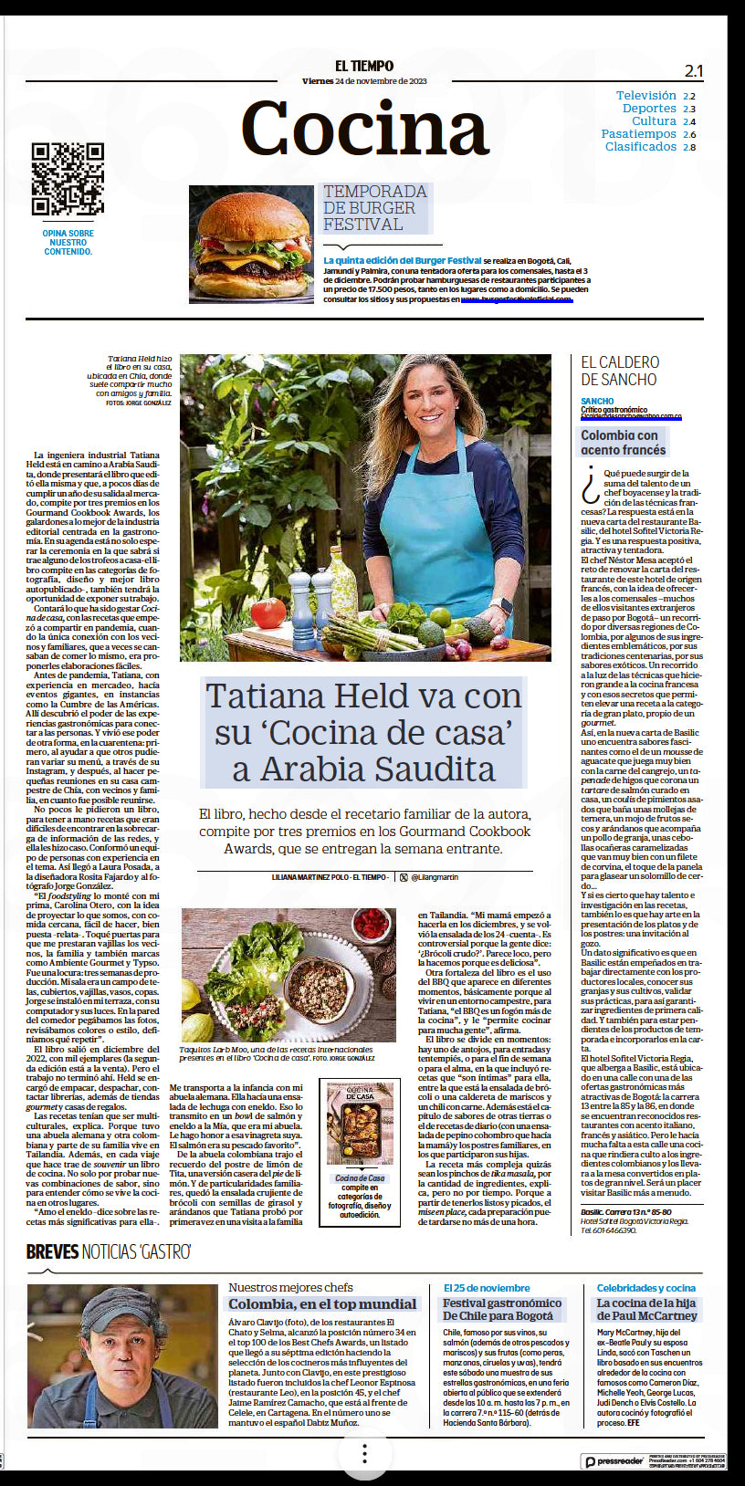 La autora ganó este lunes en los Gourmand World Cooking Awards el galardón al mejor libro auto publicado y también se ubicó en el cuarto lugar del mundo con el mejor diseño de su libro. Con imágenes del reconocido fotógrafo Jorge H. González Gutiérrez, el libro deja ver una propuesta de variados platos, curados por la autora, con sus recetas favoritas para compartir. Antojos, tentempiés, comidas para el fin de semana, sabores de otras tierras, recetas del diario, de dulce o para una multitud, son algunas de las secciones del libro que nació como un proyecto de pandemia cuando Tatiana se hizo conocida por compartir en redes sociales las recetas reunidas a lo largo de sus viajes y su experiencia creando eventos para un público multicultural.